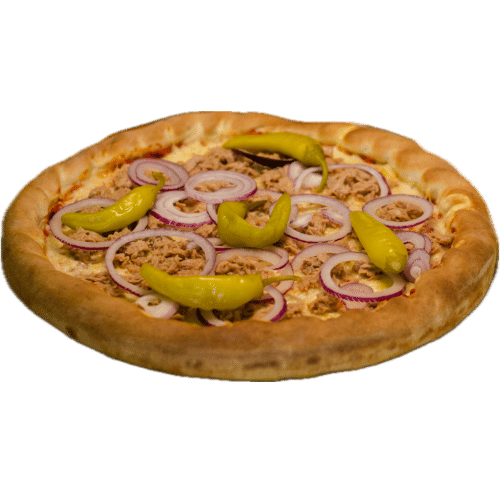Leckere Pizza mit holländischem Boden, Hähnchenfilet, Champignons, Zwiebeln und saftigem Speck.